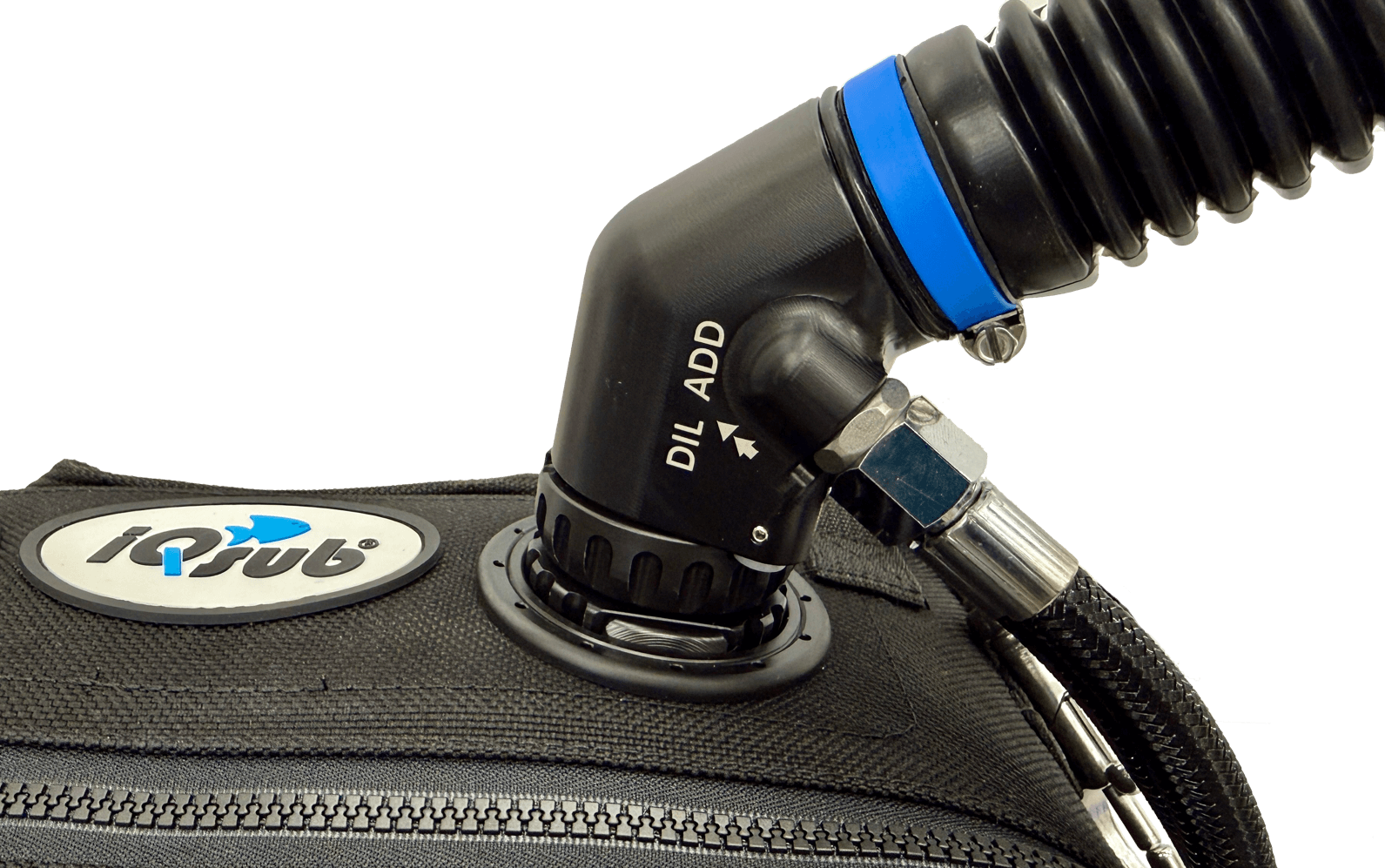 The inhalation ADV L-piece has an integrated Automatic Diluent Valve (ADV) and an inlet for manual
