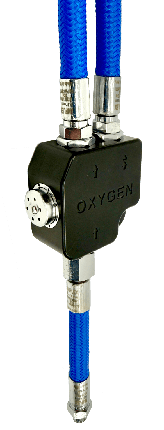 The pass-through outlet is connected to the oxygen inlet port on the FX head