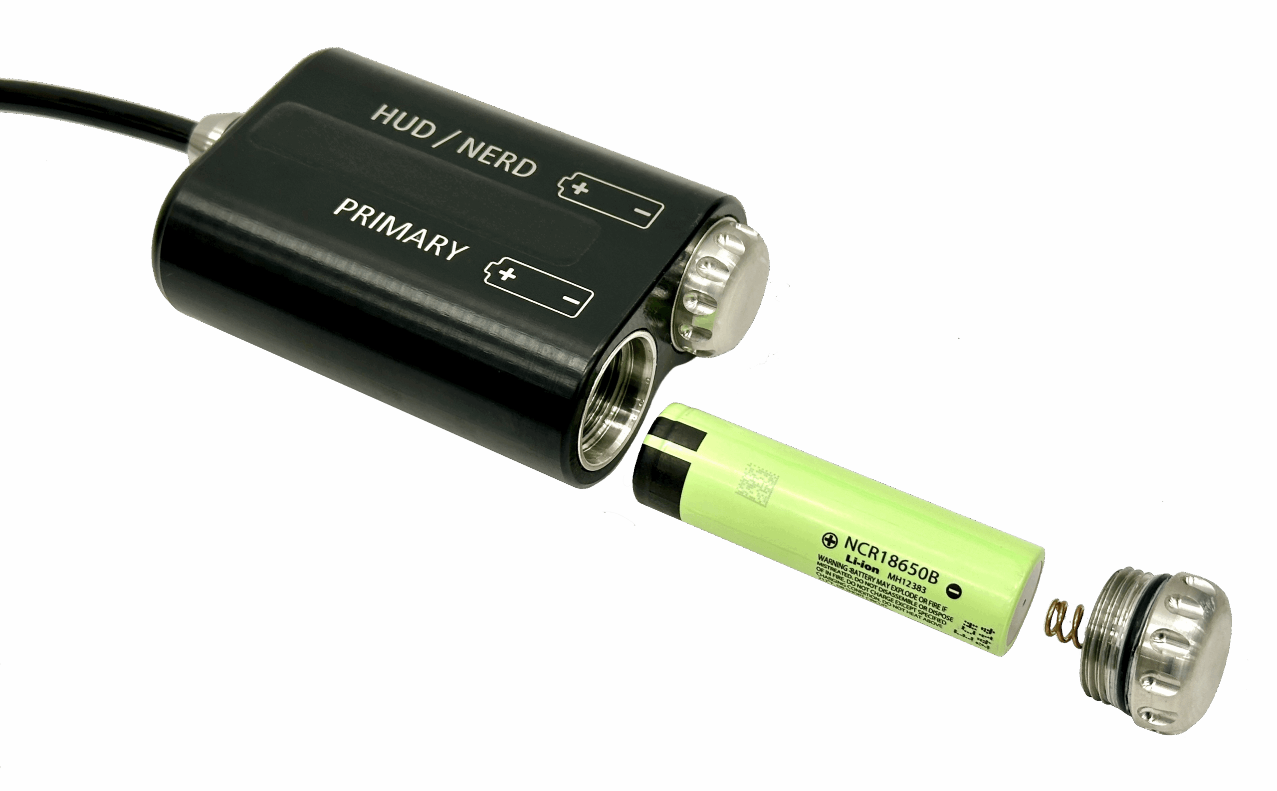 The Battery container contains two independent, easily replaceable and rechargeable Li-Ion 18650